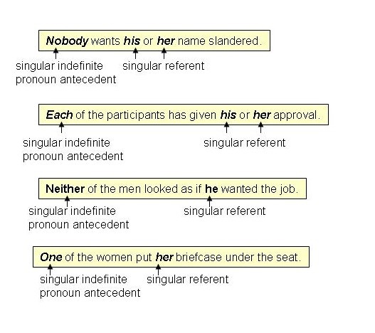 When writing about men, use he, him, and his. When writing about women, use she and her. If you don't know the gender, use he or she, him or his, or his or her. Only use they and their if the antecedent is plural.