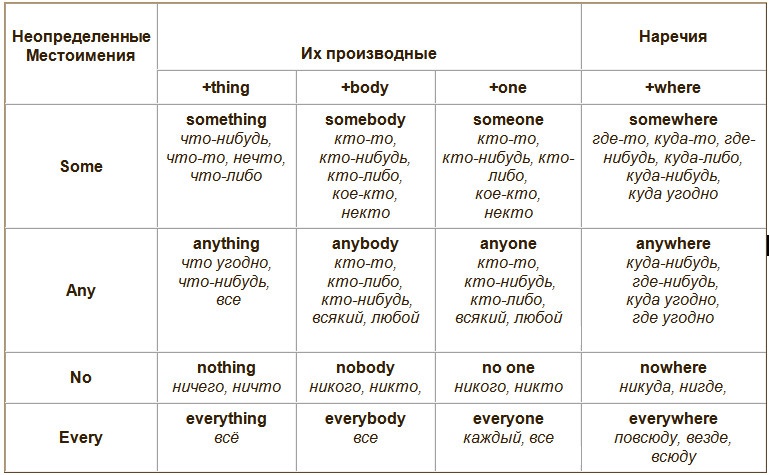 | anybody (anyone) | Кто-то, кто-нибудь, некто | Используется в вопросах и отрицаниях. | Does anyone hear me? Did I say anything inappropriate? Меня кто-нибудь слышит? Я что, сказал что-то неподходящее? |