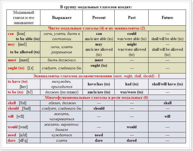Модальные глаголы с переводом и транскрипциейМодальные глаголы, назначение и употребление которых возможно только с присутствием в предложении инфинитива. При этом в наличии частицы toнет необходимости.