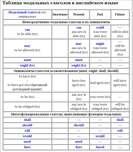 Формы модального глагола may и mightИх всего две. Первая используется в настоящем времени, вторая – в прошедшем, а также в сослагательном наклонении, когда глагол выражает возможное, желательное либо предполагаемое действие. В русской грамматике признаком условного наклонения у глагола является частица «бы». Все формы английского модального глагола показаны ниже в таблице: