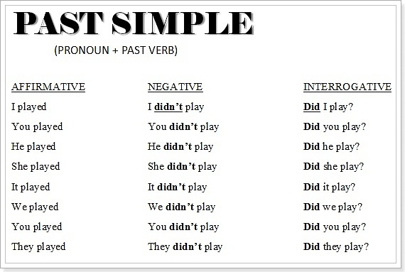 Время PastSimple, таблицаДля образования этой временной конструкции понадобится форма Past Simple смыслового глагола с добавлением окончания -ed у правильных глаголов или использованием II формы неправильных глаголов.