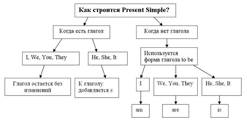 Образование времени Present Simple производится при помощи глагола в форме инфинитива (без частицы to) для 1-го и 2-го лиц, а также для множественного числа 3-го лица. В единственном числе 3-го лица глагол принимает окончание –s или –es.