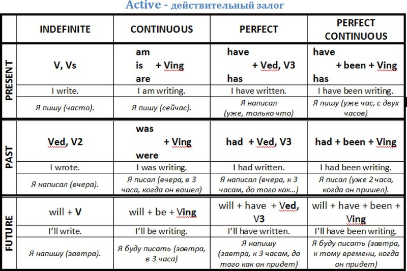 Активный залог в английском языке: таблица временАктивный залог может употребляться в любом времени английского языка. Таблица поможет наглядно представить грамматические формы образования активного залога.